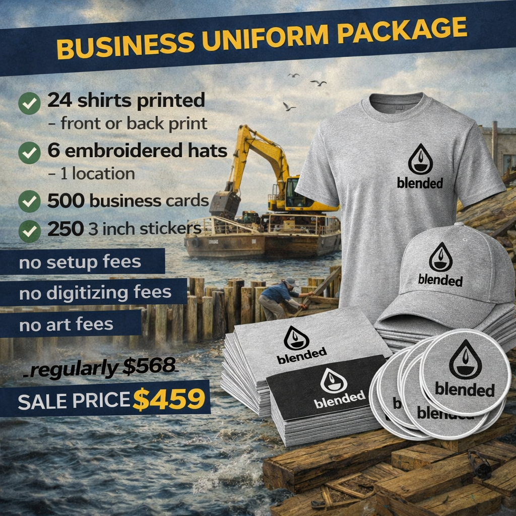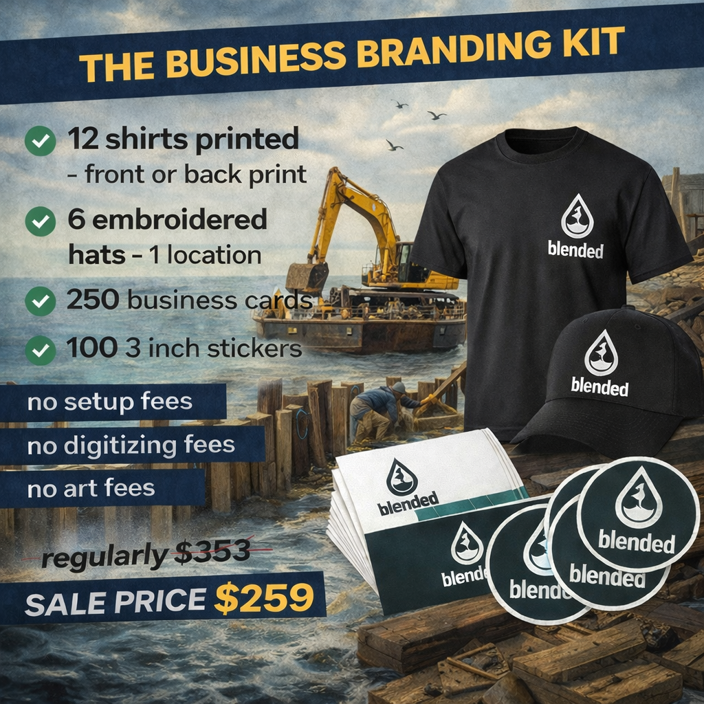 Get your business looking professional and consistent with our Business Branding Kit. This starter package is perfect for contractors, small businesses, startups, and growing brands that want clean, professional branded apparel and marketing materials without the extra fees.